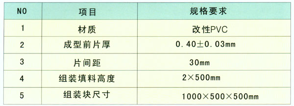双向波淋水填料,其片形由正弦波和梯形波分段错位的直波组成,提高了气水的扰流和下泄速度减缓,提高了填料的散热特性,由于增大了通孔面积,保持胶球的畅通,提高防泥垢堵塞的能力,其热力、特性和阻力特性与引进的复合波相当,冷却效果较好。