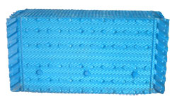 该型淋水填料的设计,主要是提高塔内的水波下流稳定,亲水性好,水注在半圆形点波面上蜿蜒流动,形成水膜,不使冷却水通过边缘而飞溅起来,提高塔内的收水率,扩大了进水与空气的接触面积,延缓了水流速度,延长了热、湿交换时间,降低运行噪声,从而使塔内的水达到预期的冷却效果,该种填料在使用上比较简单,组件质量轻,冷却效果好,在大型的中央空调上使用较为广泛。